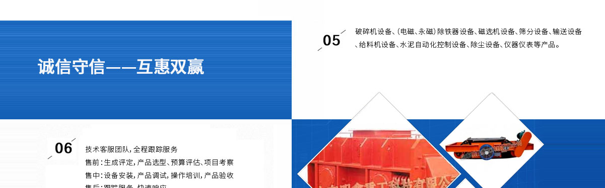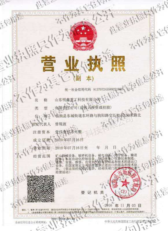 山東明鑫重工科技有限公司為是集科研開發(fā),設(shè)計(jì)制造、銷售、安裝、調(diào)試為一體的技術(shù)制造企業(yè)。公司位于美麗的****風(fēng)箏都-濰坊市(國(guó)家AAAA級(jí)森林公園-沂山景區(qū)駐地)臨朐東城工業(yè)園。本公司產(chǎn)品種類有:破碎機(jī)設(shè)備,(電磁、永磁)除鐵器設(shè)備,磁選機(jī)設(shè)備,篩分設(shè)備,輸送設(shè)備,給料機(jī)設(shè)備,水泥自動(dòng)化控制設(shè)備、除塵設(shè)備,儀器儀表等產(chǎn)品。其產(chǎn)品有五十多個(gè)系列,四百多種規(guī)格,并可根據(jù)客戶需求設(shè)計(jì)生產(chǎn)相應(yīng)的產(chǎn)品。其產(chǎn)品廣泛應(yīng)用于冶金、電力、煤炭、礦山、造紙、食品、化工建材、耐火材料、磚瓦、水泥、玻璃等行業(yè),產(chǎn)品暢銷國(guó)內(nèi)三十多個(gè)省市、自治區(qū)。